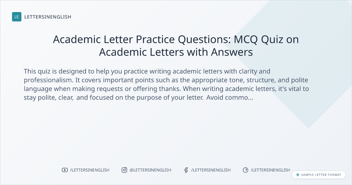 This quiz is designed to help you practice writing academic letters with clarity and professionalism. It covers important points such as the appropriate tone, structure, and polite language when making requests or offering thanks. When writing academic letters, it’s vital to stay polite, clear, and focused on the purpose of your letter. Avoid common mistakes like using slang, informal language, or being unclear. Practicing these skills can help you communicate more effectively in formal academic settings.