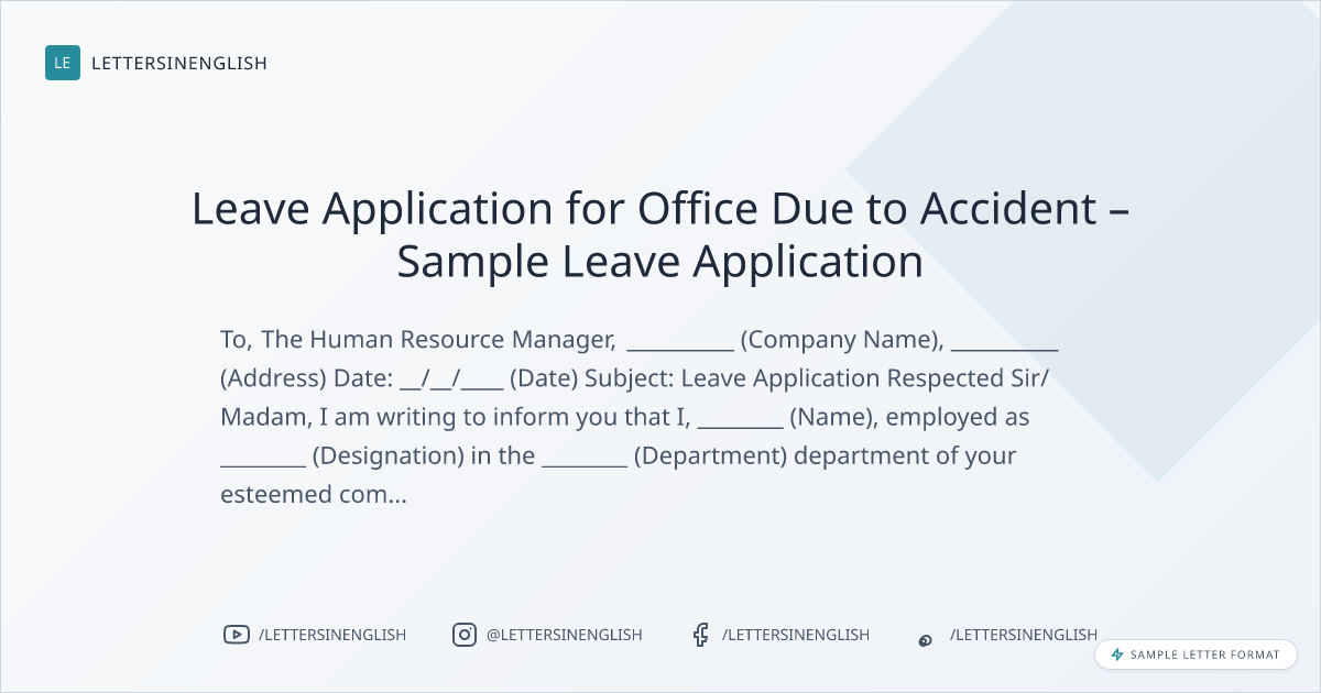 I am writing this letter to inform you that I met with an accident on _________ (details of the accident) and which led to some serious injuries due to which I will not be able to continue my job responsibilities for _________ (Number of days) days. I beg to state that I need a rest for the above-mentioned dates.