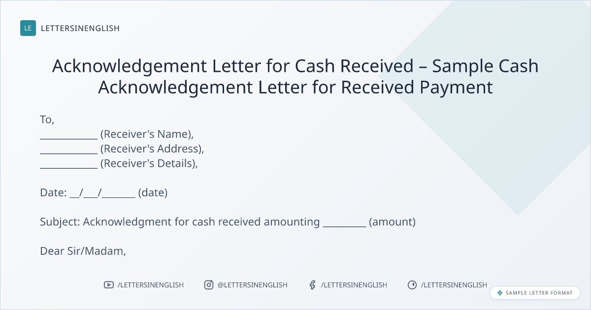 Subject: Acknowledgment for cash received amounting _________ (amount)