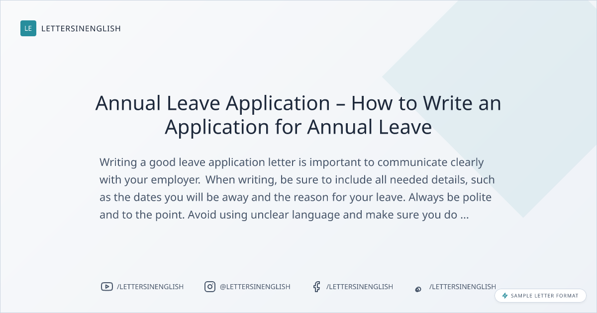 With due respect, I am _____________ (name), working in the ___________ (department) as a ___________ (designation). I am writing to request annual leave from ___________ (start date) to ___________ (end date) due to ___________ (reason for leave).