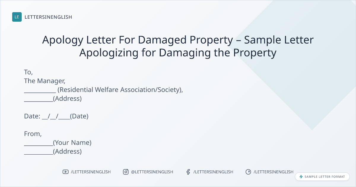 Courteously, I am __________(Your Name) living in __________(Mention your house/flat/bungalow number) of __________(Mention block name/number). I am writing this letter to sincerely apologize for damaging the __________(Mention damage done – broke fence/ crack on a wall, any other damage) on date__________(Mention Date). I assure you this incident was a completly unintentional and I had no intend to harm the property as there is construction going on at my place from past __________(Number of days/weeks/months).