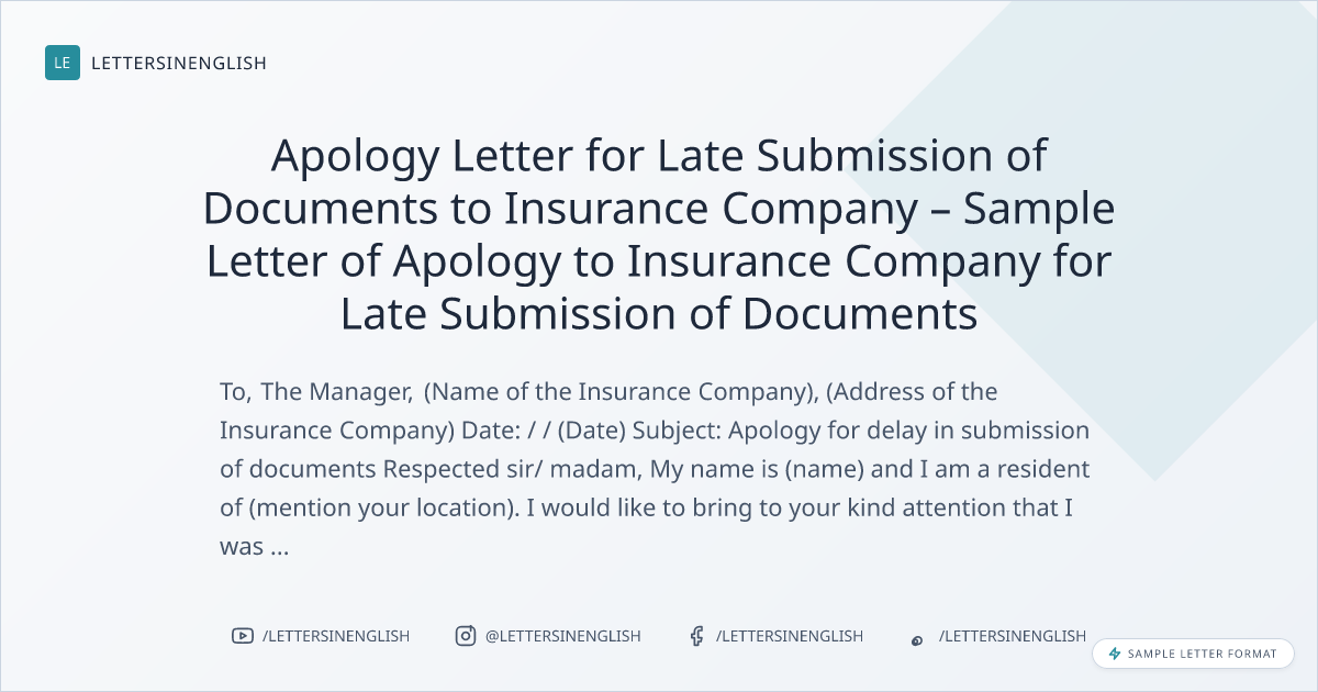 LETTERSINENGLISHApology Letter for Late Submission of Documents to Insurance Company – Sample Letter of Apology to Insurance Company for Late Submission of Documents