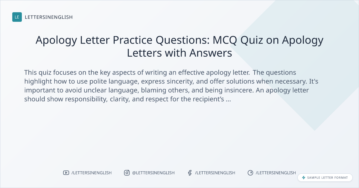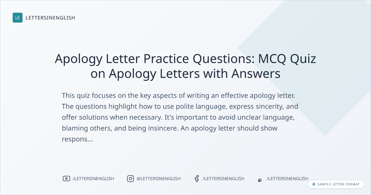 This quiz focuses on the key aspects of writing an effective apology letter. The questions highlight how to use polite language, express sincerity, and offer solutions when necessary. It’s important to avoid unclear language, blaming others, and being insincere. An apology letter should show responsibility, clarity, and respect for the recipient’s feelings. Clear communication is essential to ensure your message is understood and helps resolve any misunderstandings.