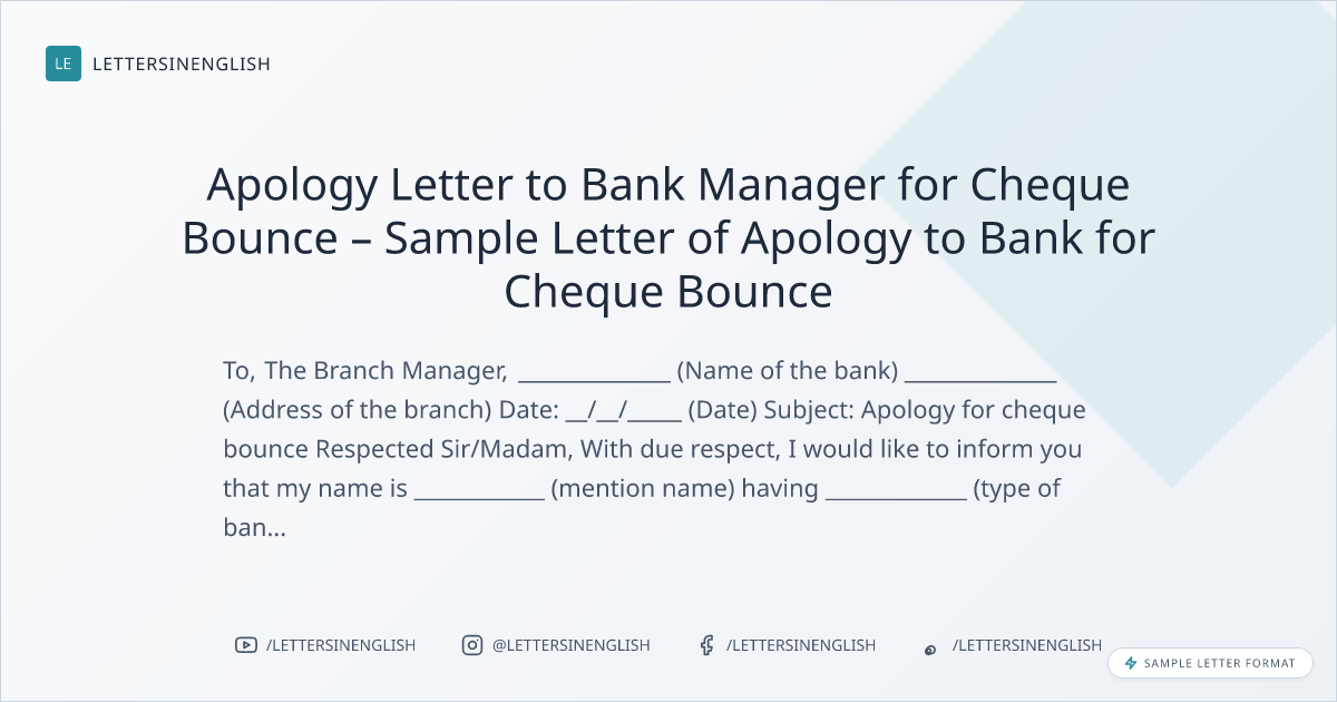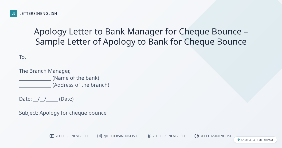 Apology Letter to Bank Manager for Cheque Bounce – Sample Letter of Apology to Bank for Cheque Bounce