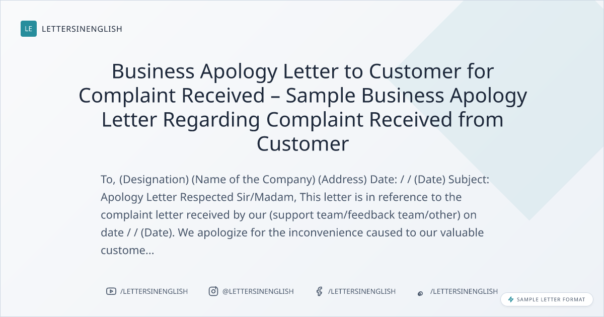Business Apology Letter to Customer for Complaint Received – Sample Business Apology Letter Regarding Complaint Received from Customer