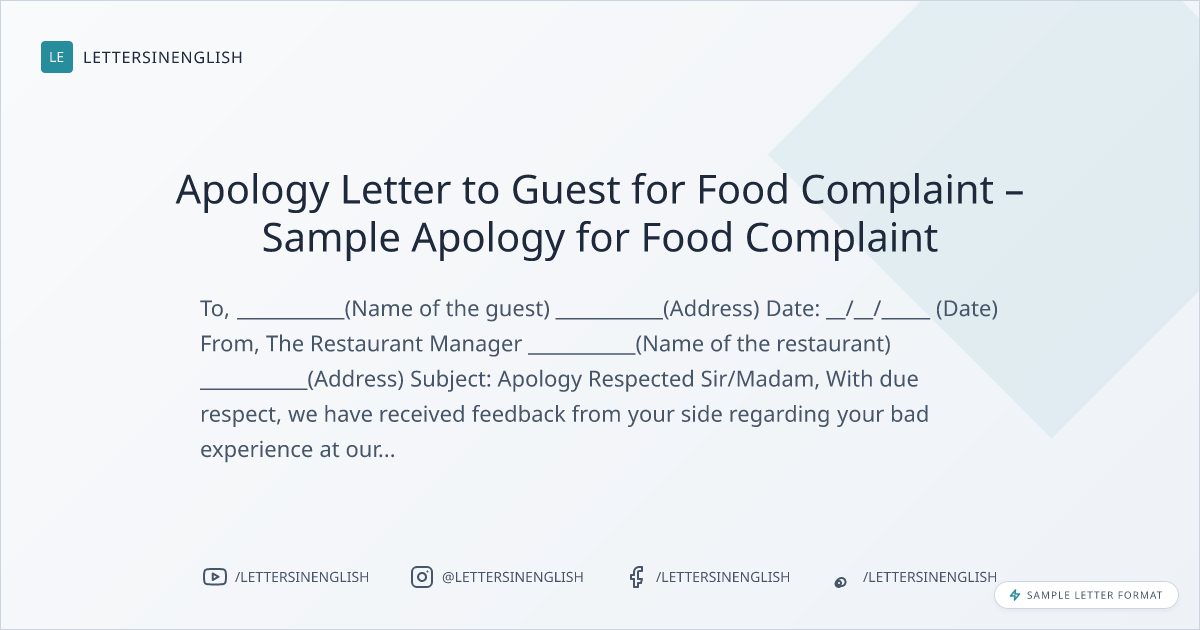 Apology Letter to Guest for Food Complaint – Sample Apology for Food Complaint