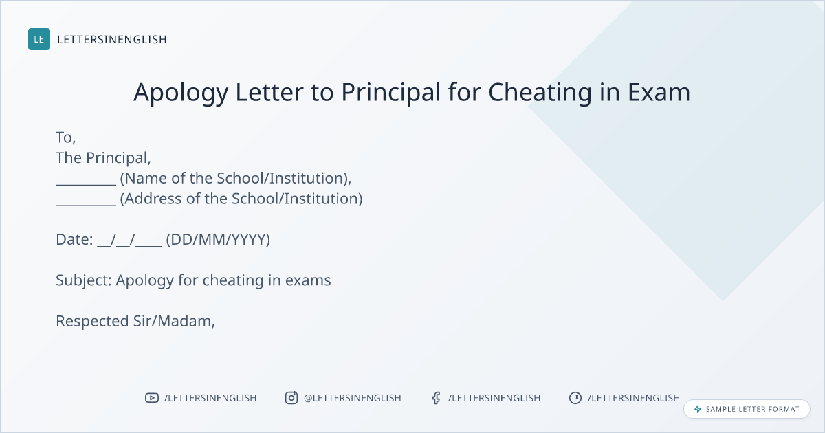 I extend my deep apologies for committing grieves offense of cheating in the _______ (Subject) exam held on ________, (exam date) ___________ (despite repeated warnings – if applicable). I was _____ (coping the answers) and I was punished by being _______ (barred from the examination hall). I learned my lesson immediately and assure you that I won’t be repeating the said mistake again.