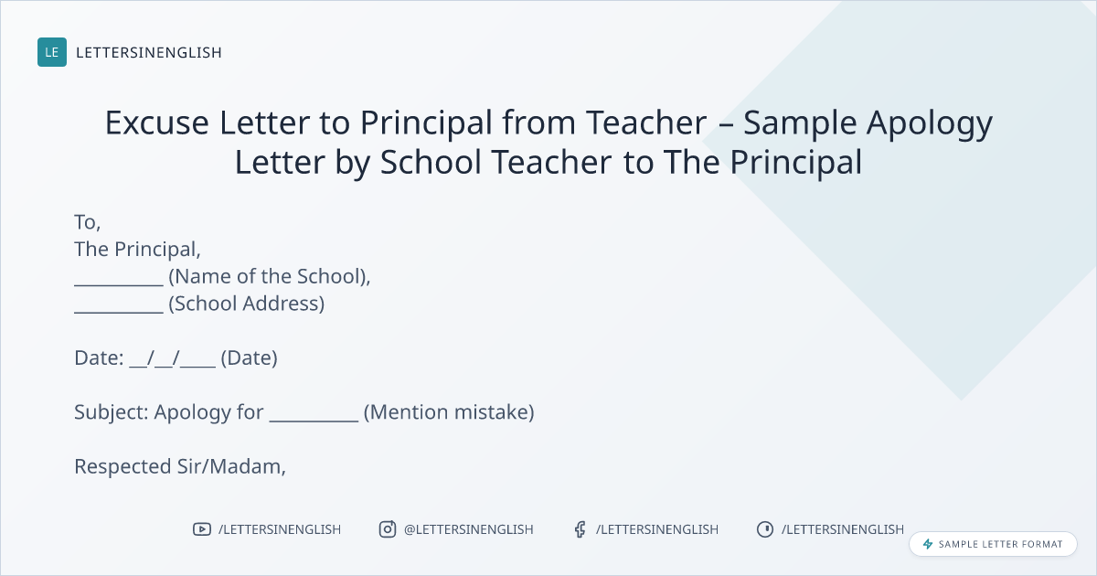 Excuse Letter to Principal from Teacher – Sample Apology Letter by School Teacher to The Principal