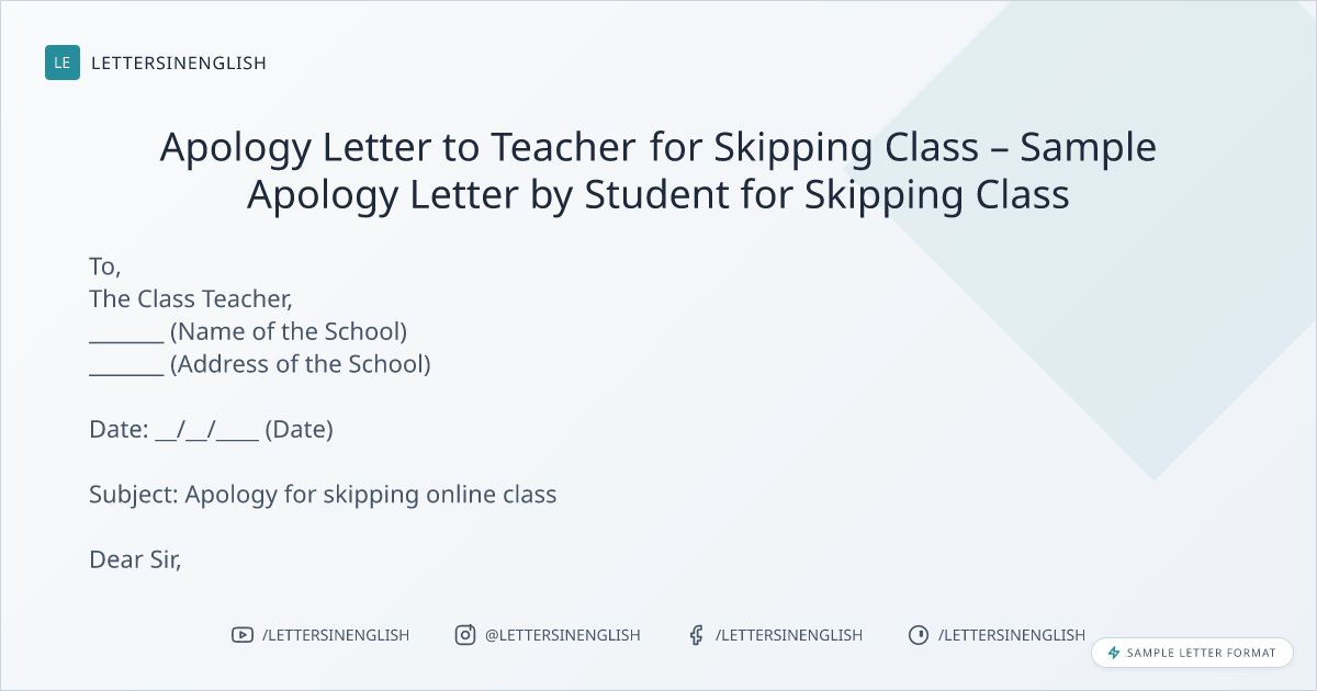 Apology Letter to Teacher for Skipping Class – Sample Apology Letter by Student for Skipping Class