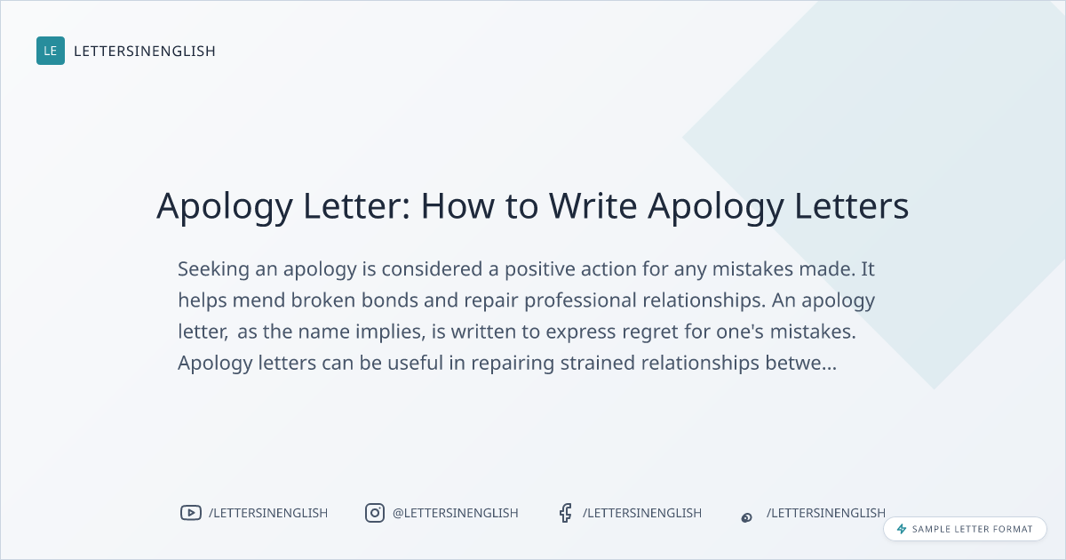 Seeking an apology is considered a positive action for any mistakes made. It helps mend broken bonds and repair professional relationships. An apology letter, as the name implies, is written to express regret for one’s mistakes. Apology letters can be useful in repairing strained relationships between people. It is essential to draft the apology letter precisely and professionally because it becomes a permanent record of an event and the subsequent response.