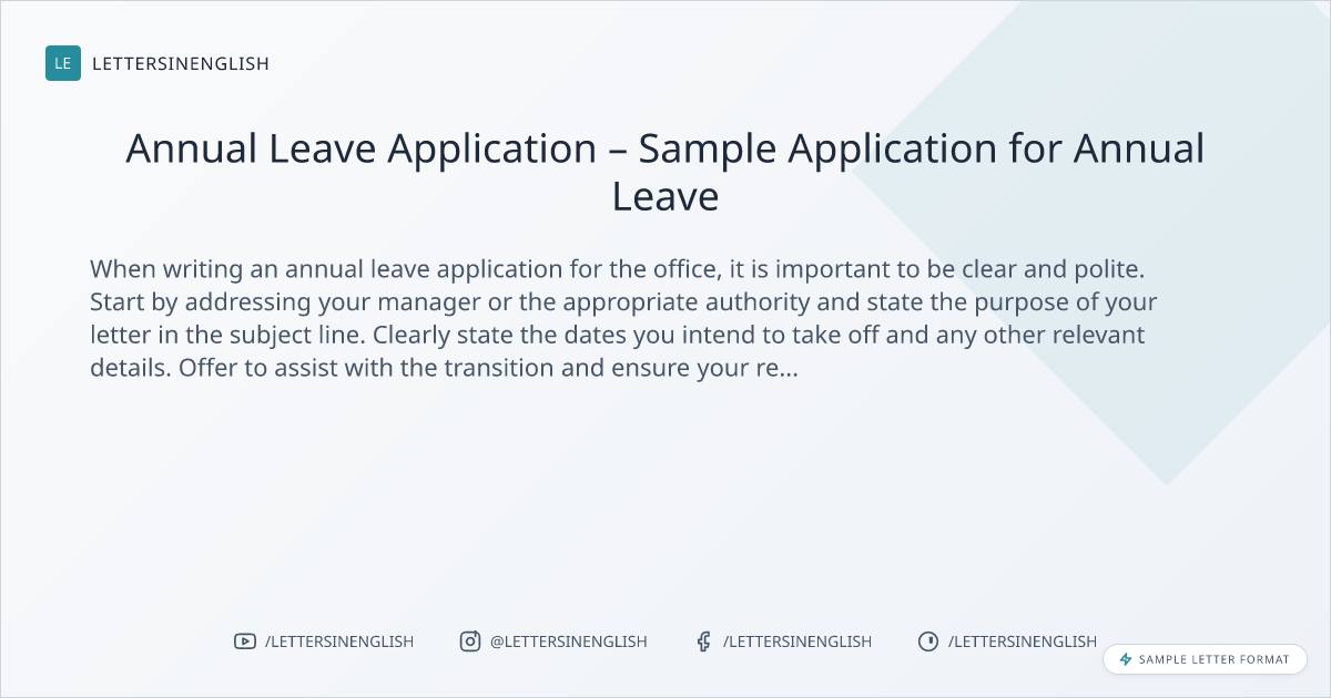 When writing an annual leave application for the office, it is important to be clear and polite. Start by addressing your manager or the appropriate authority and state the purpose of your letter in the subject line. Clearly state the dates you intend to take off and any other relevant details. Offer to assist with the transition and ensure your responsibilities are covered during your absence. Maintain a respectful tone and express gratitude for their understanding. Conclude with a polite request for approval.
