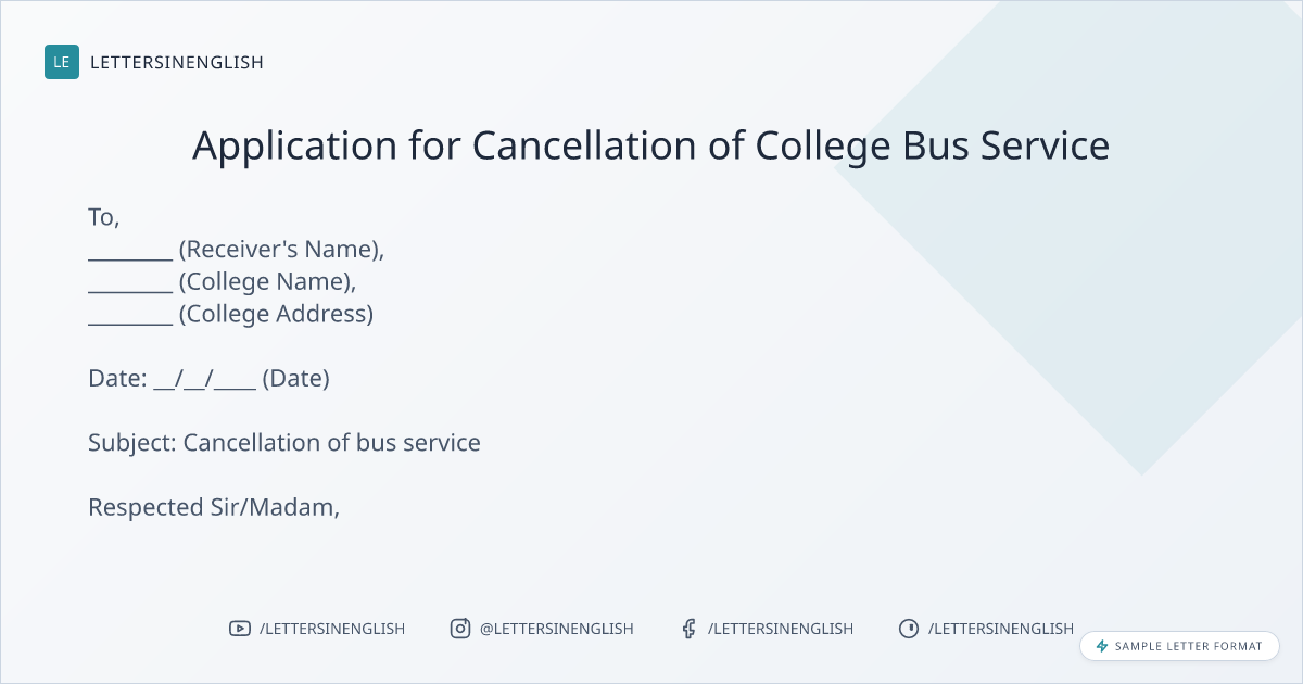 I request you to kindly discontinue the bus facility that I have been availing for pickup from ________ (Pick up point). I have been traveling via route number _______ (Route number) for which bus bearing _______ (bus number) number is used. Respected, my drop location is _________ (Mention location)