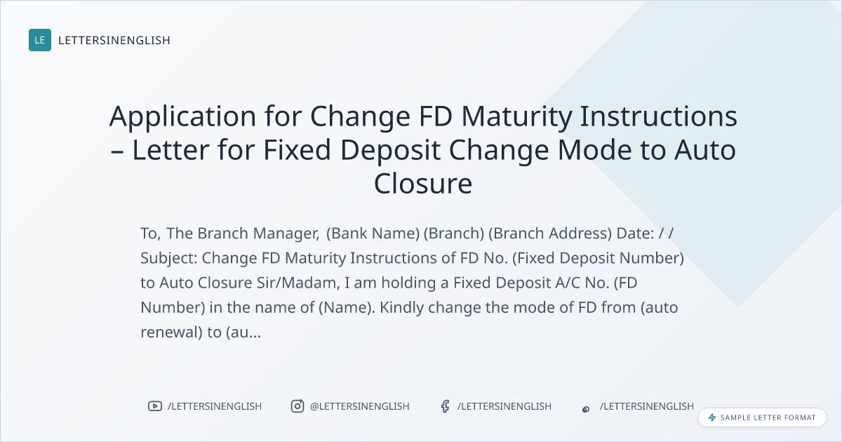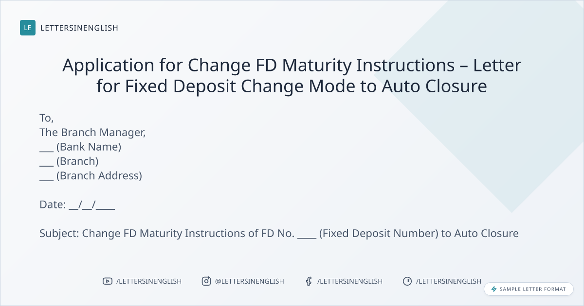 Application for Change FD Maturity Instructions – Letter for Fixed Deposit Change Mode to Auto Closure