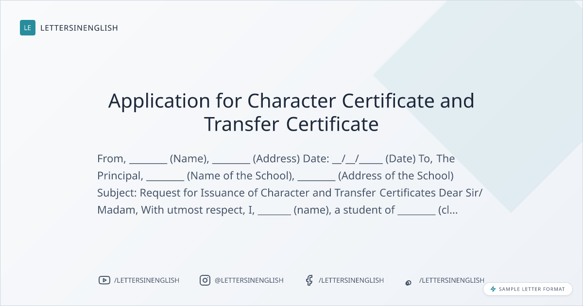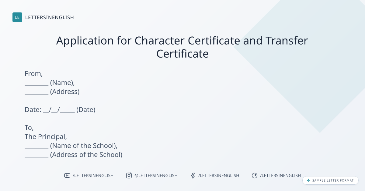 Most humbly, I am writing this letter in order to request you for the issuance of character certificate and transfer certificate in my name i.e. ______ (your name). As I am looking forward to taking admission to another school, I will be requiring the mentioned documents. I request you to kindly issue the required certificates by __/__/____ (Date).