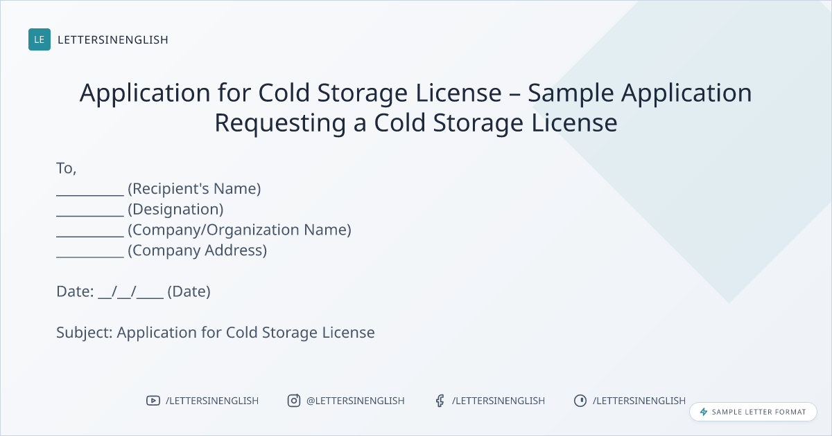 I am writing to formally request a license to operate a cold storage facility at __________ (Location/Address). As the operator of __________ (Business/Company Name), I aim to support the safe and efficient storage of perishable goods in compliance with local regulations.