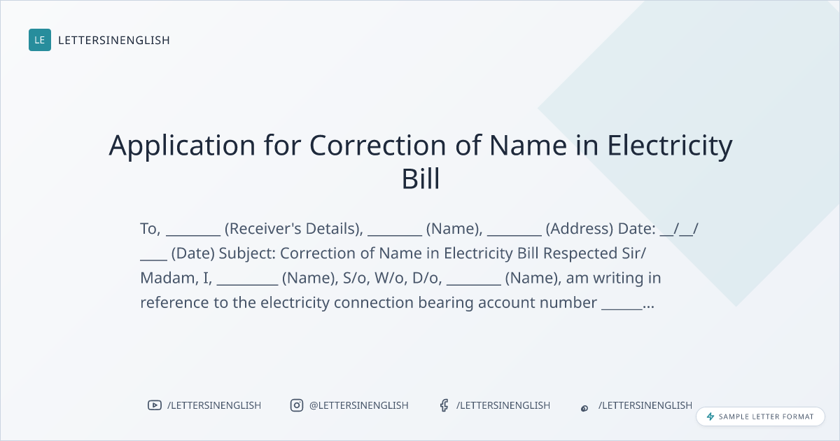 I would like to state that the above-mentioned electricity connection is done at ______ (address) in my name i.e. __________ (Name) and the electricity bill has been received on ________ (date of bill received) via _______ (online/ offline). But the name mentioned on the electricity bill is incorrect. ___________ (Incorrect Name) comes printed on the bill which is incorrect. I request you to kindly correct my name spelling to ________ (Correct spelling).