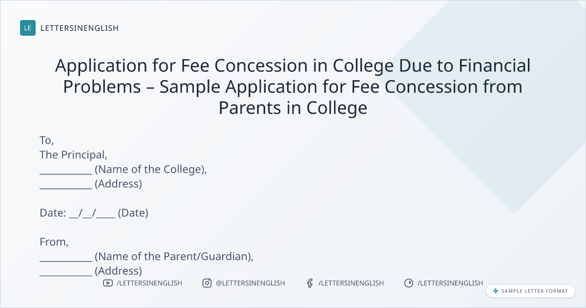 Application for Fee Concession in College Due to Financial Problems – Sample Application for Fee Concession from Parents in College