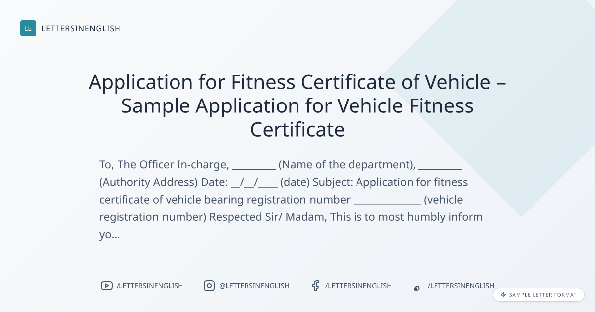 This is to most humbly inform you that I am ___________ (name) and I am the owner of ___________ (vehicle name) bearing registration number ___________ (mention registration number) and I write this letter to request you to kindly issue me with the fitness certificate of the said vehicle.