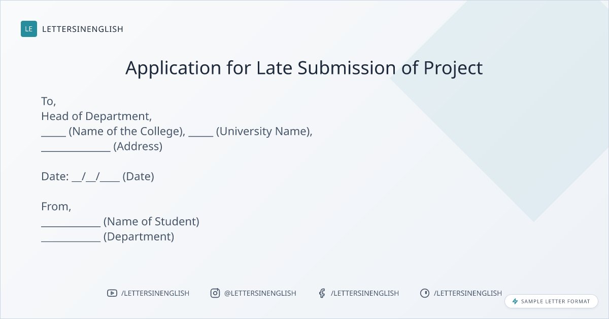 I am writing this letter to request you extension for submission of the project _______________ (Name of the Project). It was given on ____________ (Date) and the submission date was ______________ (Date of submission). I request some more days _____________ (Provide the number of days with date) to complete my project. I was not able to complete my project because ___________________ (Reason of not completion on time).