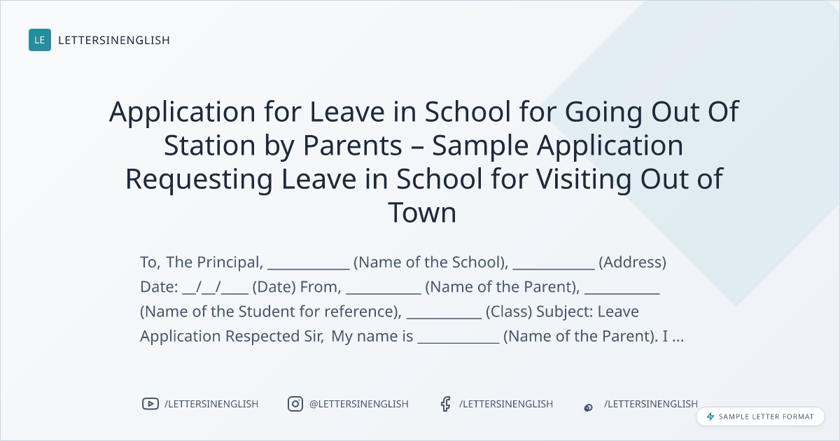 Application for Leave in School for Going Out Of Station by Parents – Sample Application Requesting Leave in School for Visiting Out of Town
