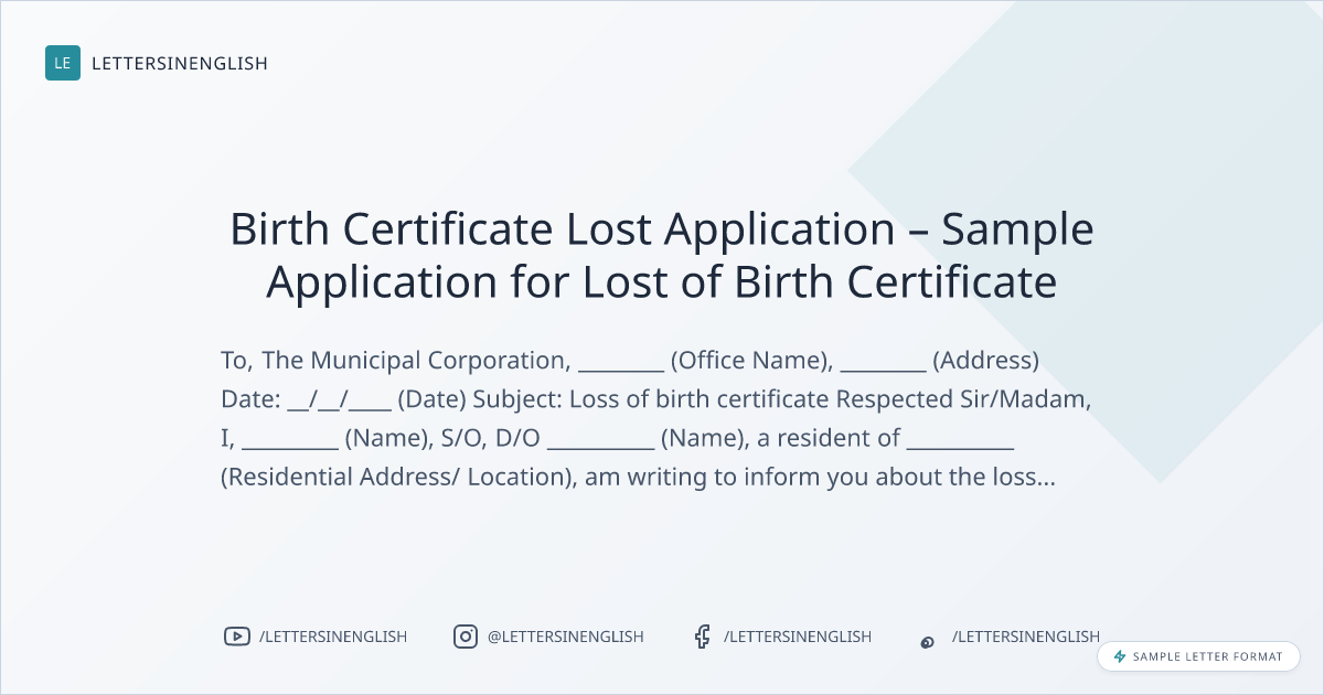 Respected, I am writing this letter to inform you that the birth certificate issued to me in my name got lost during ________ (Journey/ shifting/ any other). Therefore, I request you to kindly guide me through the procedure for the issuance of a duplicate birth certificate.
