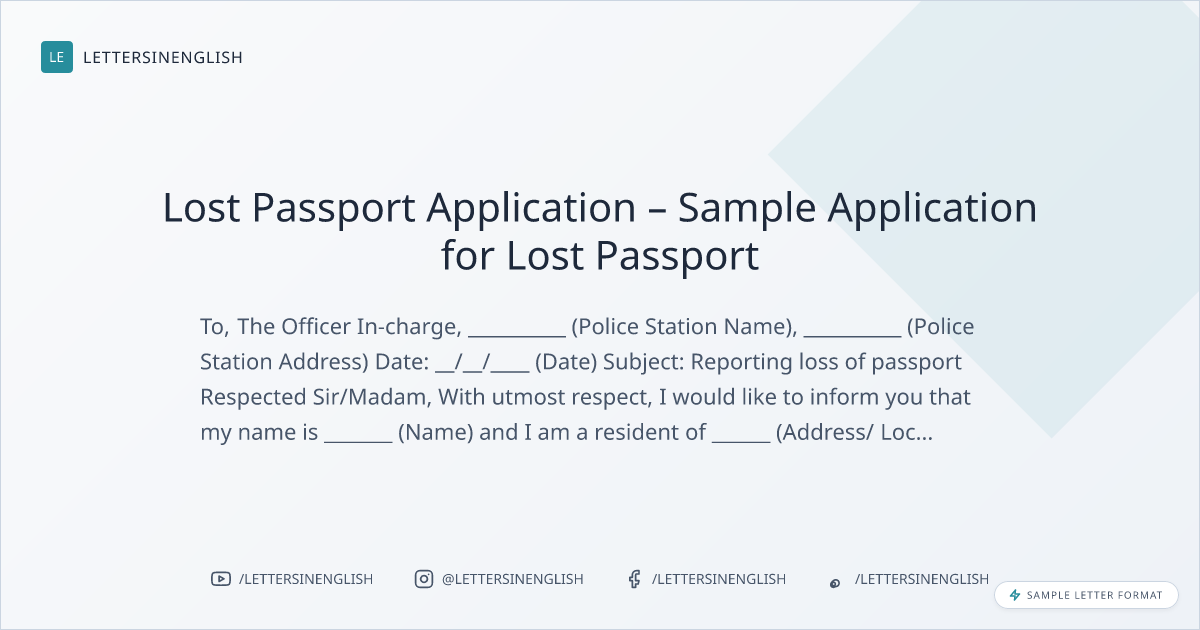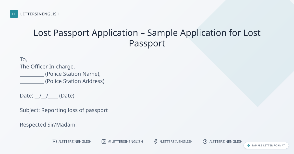 Most humbly, I would like to state that I do hold a passport bearing passport number_________ (Passport number) in the name of ________ (your name) issued at ________ (Issued Place). This is to regretfully inform you that I am unable to find my passport which was issued to me by _______ (Passport office name) for last _______ (Duration – days/ weeks) which is becoming a matter of concern for me.