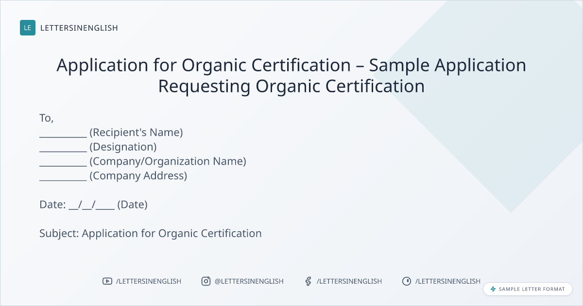 I am writing to formally request organic certification for __________ (Product/Service) at __________ (Company/Organization Name). As a company committed to sustainability and providing high-quality, eco-friendly products, we believe that organic certification will enhance our brand’s reputation and credibility in the market.