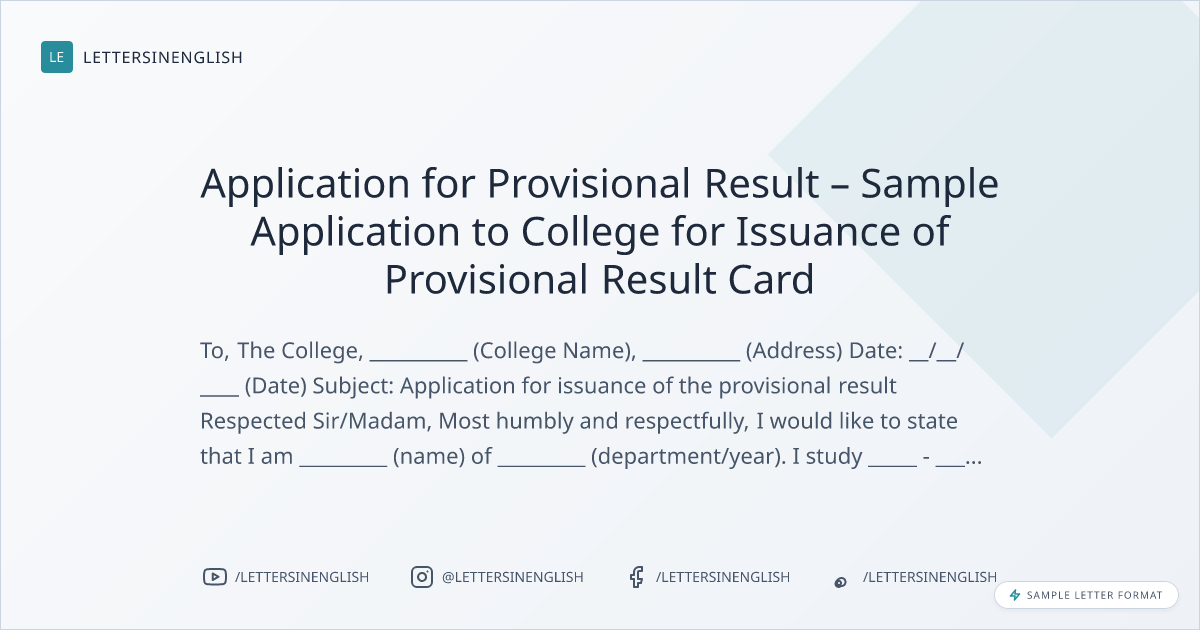 Application for Provisional Result – Sample Application to College for Issuance of Provisional Result Card