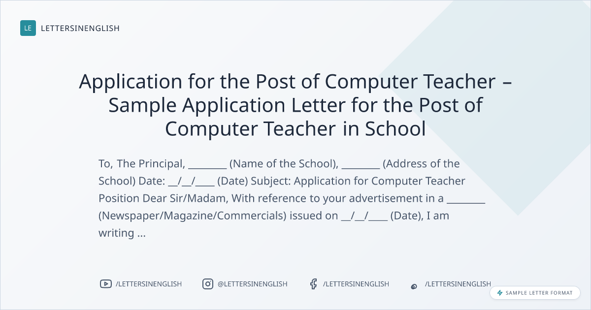 Application for the Post of Computer Teacher – Sample Application Letter for the Post of Computer Teacher in School