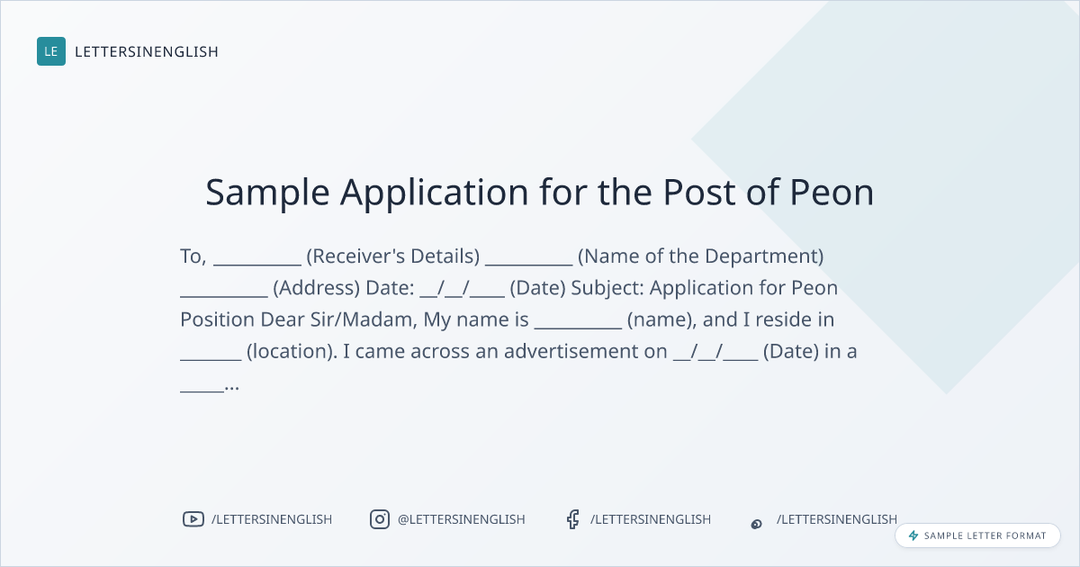 I saw an advertisement on __/__/____ (Date) in a ________ (Newspaper/ Magazine/ Commercials) for hiring of a peon for your company. I believe I could be a perfect fit for that vacancy available. I am _______ (Age) years old and have qualified ________ (Course) from _________ (School/ College Name) which got complete in _______ (Year).