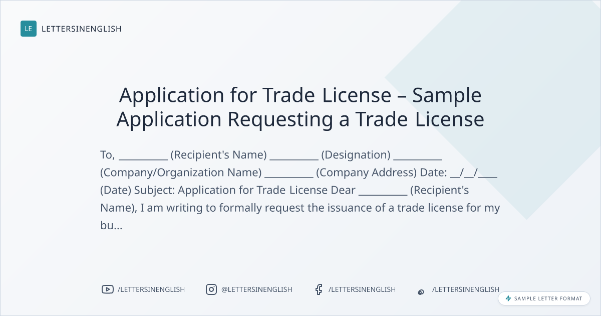 I am writing to formally request the issuance of a trade license for my business, __________ (Your Business Name), located at __________ (Your Business Address). We are planning to offer __________ (Type of Trade/Service) and require the appropriate trade license to operate legally within the jurisdiction of __________ (Location/City).
