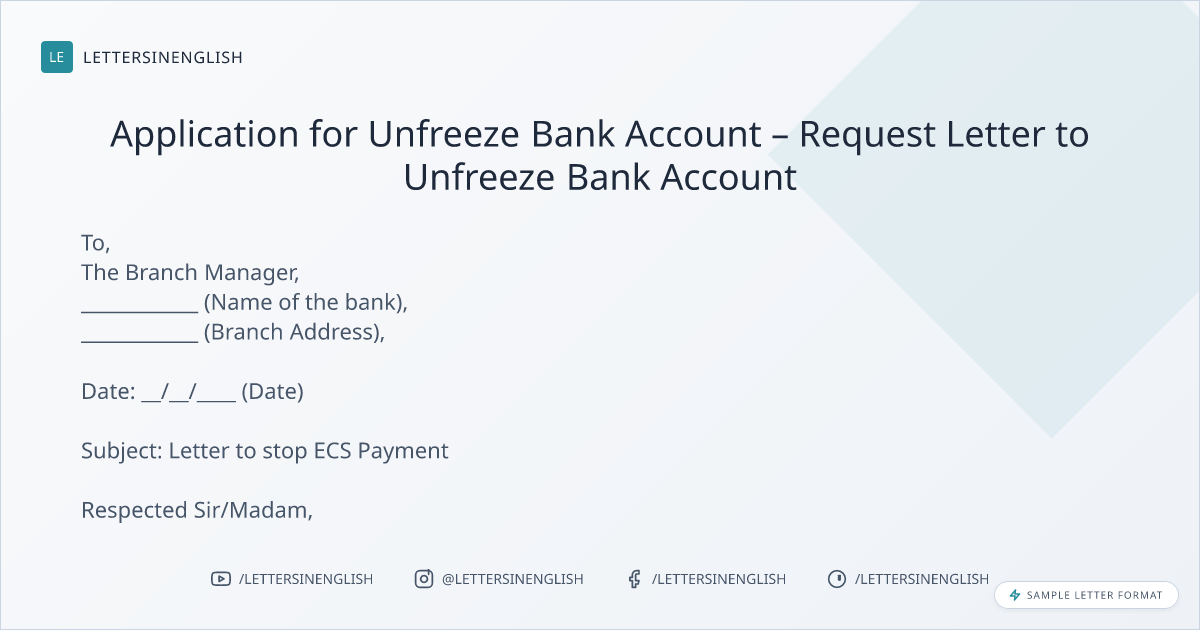 Application for Unfreeze Bank Account – Request Letter to Unfreeze Bank Account