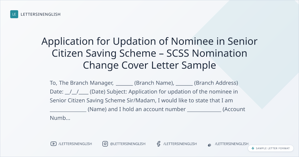 Application for Updation of Nominee in Senior Citizen Saving Scheme – SCSS Nomination Change Cover Letter Sample