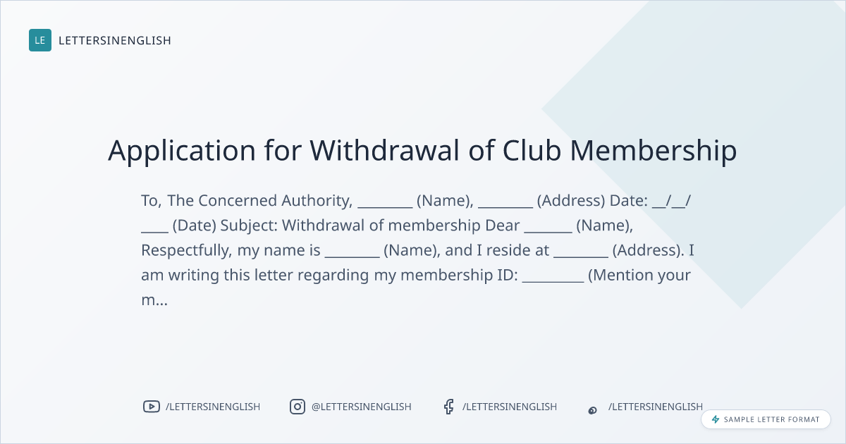 I am writing this letter in order to request you to the withdrawal of my name from the membership that I took on __/__/____ (Date) and which is registered on _______ (Mobile number) number. I am writing this letter as I am no more in need of the membership and I request you to discontinue all the services availed.