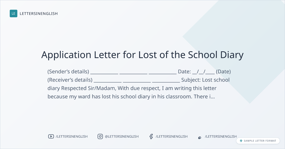 I would request you to please inform me if you find a lost diary. My ward lost it in his classroom “________ (class)”. The diary is ______ (color) in color, rectangular in shape, and has a name slip with his/her name on it. It is compulsory for all the children to carry their diaries with them as it contains emergency contacts and important information, hence I request you to either look for it in the Lost and Found section. Meanwhile, issue my child a new diary. I am ready to pay all applicable charges.