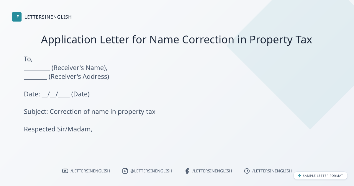 Most courteously, I would like to inform you that my name mentioned in the property tax documents is ______ (Name) whereas the actual name spelling is ______ (Correct Name). I request you to kindly correct the name spelling and do the needful at the earliest.