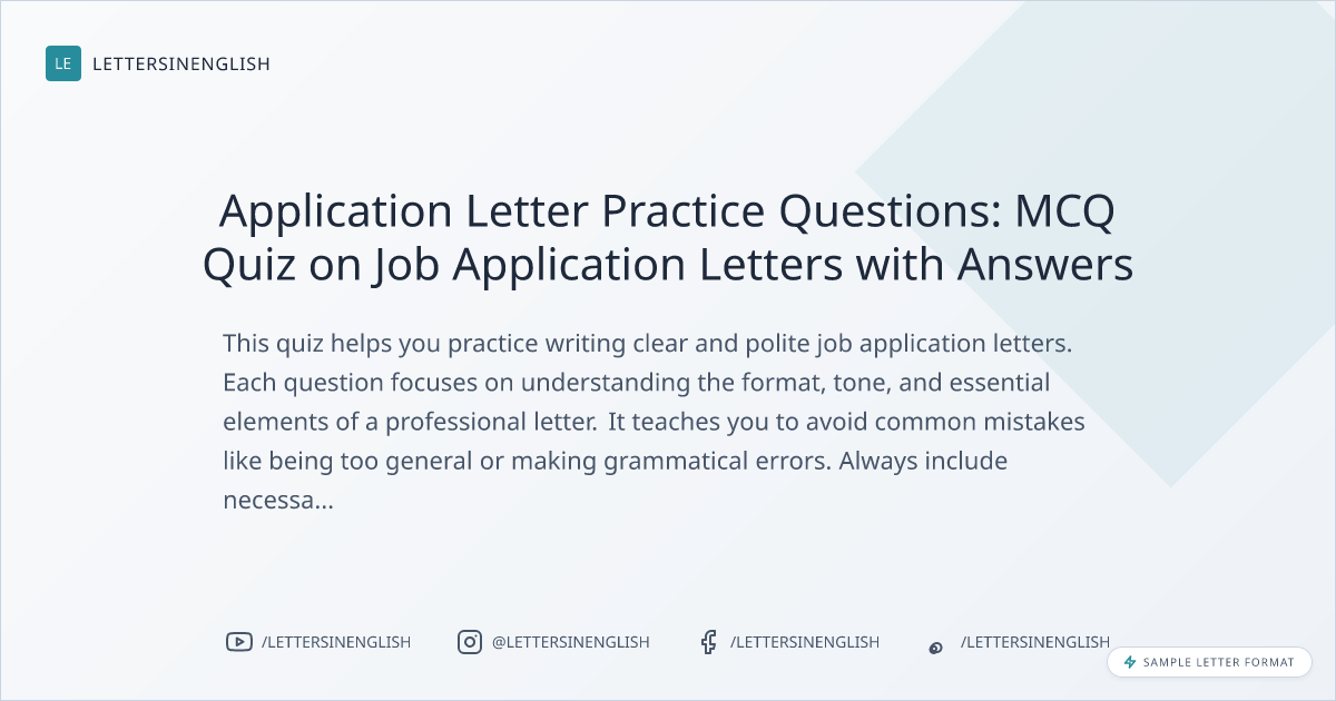 This quiz helps you practice writing clear and polite job application letters. Each question focuses on understanding the format, tone, and essential elements of a professional letter. It teaches you to avoid common mistakes like being too general or making grammatical errors. Always include necessary details, stay respectful, and ensure the language is easy to understand.