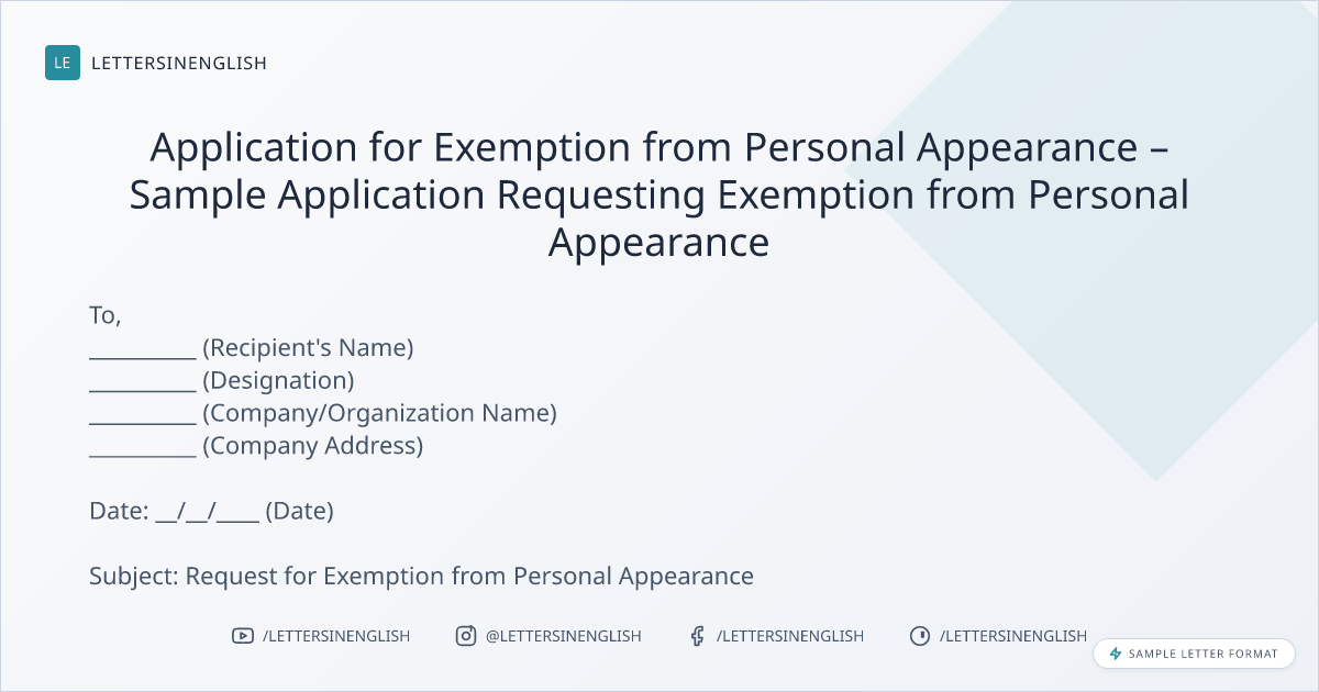 I am writing to request an exemption from appearing in person on __________ (specific date or occasion). This request is due to __________ (reason for exemption, e.g., unavoidable personal circumstances, health reasons, travel restrictions).