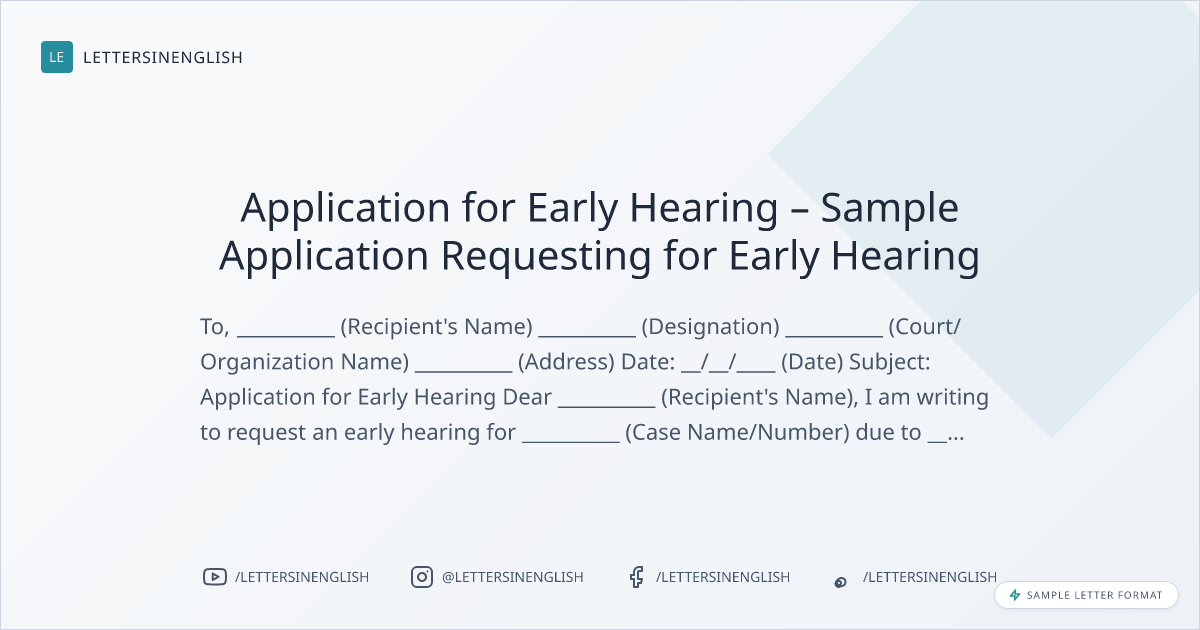 I am writing to request an early hearing for __________ (Case Name/Number) due to __________ (Reason for Early Hearing, e.g., urgency, medical reasons). The scheduled hearing date of __________ (Scheduled Date) poses significant challenges as __________ (State Challenges or Reasons).