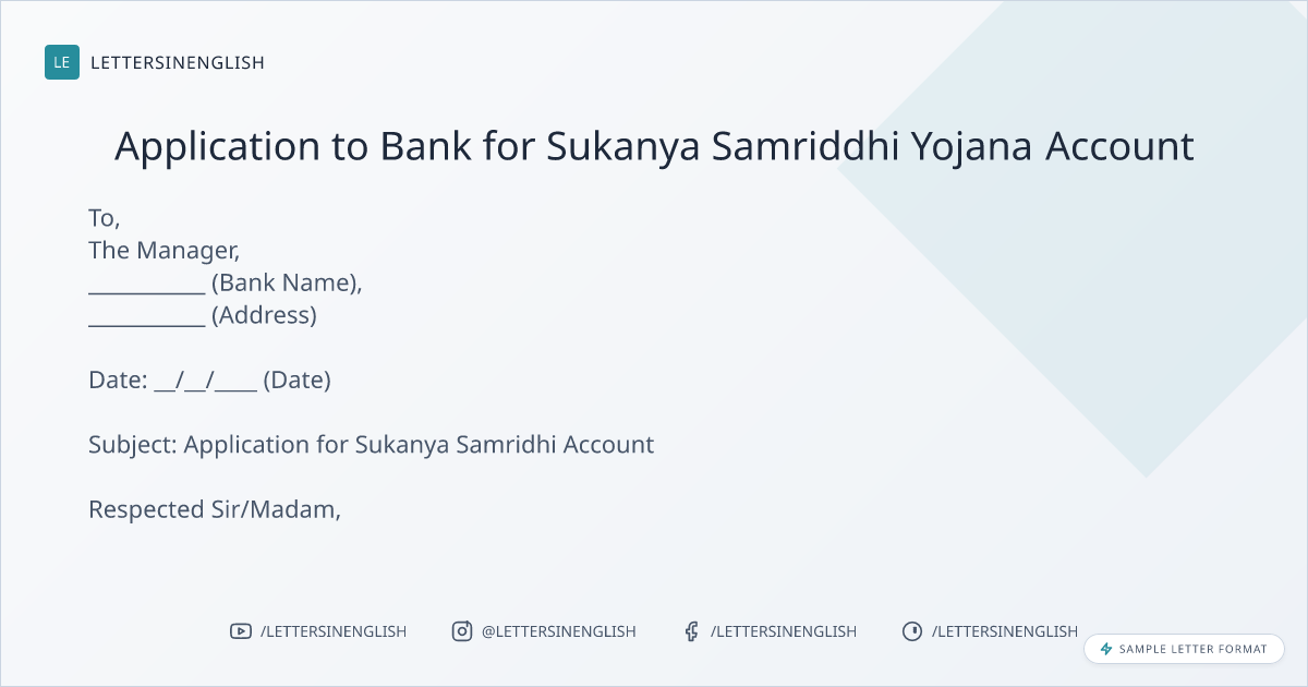 I would like to bring into your consideration that I am __________ (Name) and I am a resident of _________ (Address) and I want to open a Sukanya Samridhi Account in your branch __________ (Branch Address) in the name of ________ (Name).