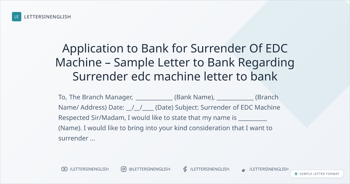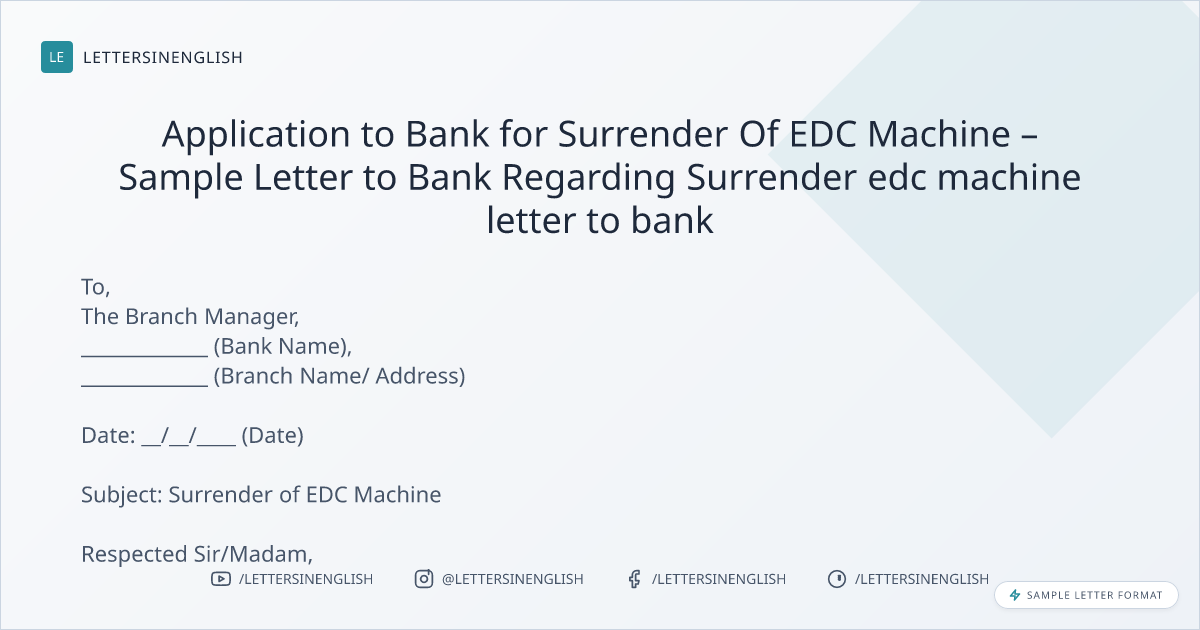 Application to Bank for Surrender Of EDC Machine – Sample Letter to Bank Regarding Surrender edc machine letter to bank