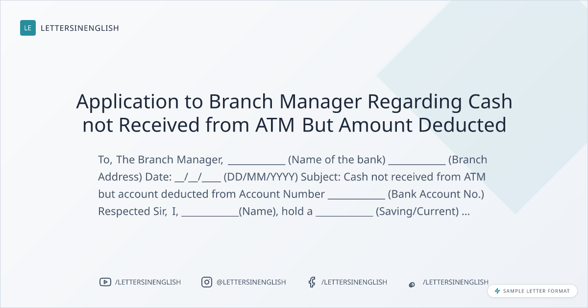 I, ____________(Name) hold a ____________ (Saving/Current) account (Bank Account Number) with your branch. I am writing this letter in regard to the attempt of cash withdrawal done on _______ (Date) from your _________ (ATM Location) ATM. I had tried to withdraw a sum of ___________ (amount), however, the amount did not dispense from ATM, however, my account got deducted with Amount __________ (Amount Deducted).