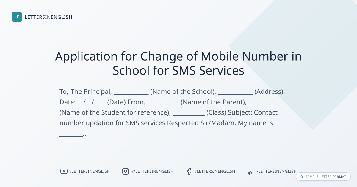 I am writing this letter to request you to kindly update my contact number in your database as ________ (I lost my SIM card/SIM damaged/Mobile Number not working) and due to which I am unable to get any updates from your side. My previous mobile number was _______ (Previous contact number), kindly update it to _________ (New mobile number)