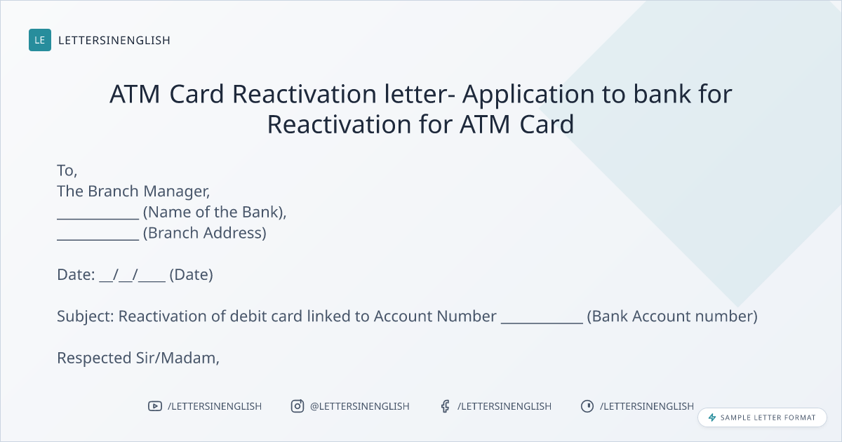 ATM Card Reactivation letter- Application to bank for Reactivation for ATM Card