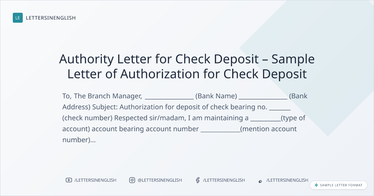 Note: Bank may ask for additional supporting documents along with this letter or as per bank norms bank may not accept authorization letter for check deposit, for more details please contact your bank.