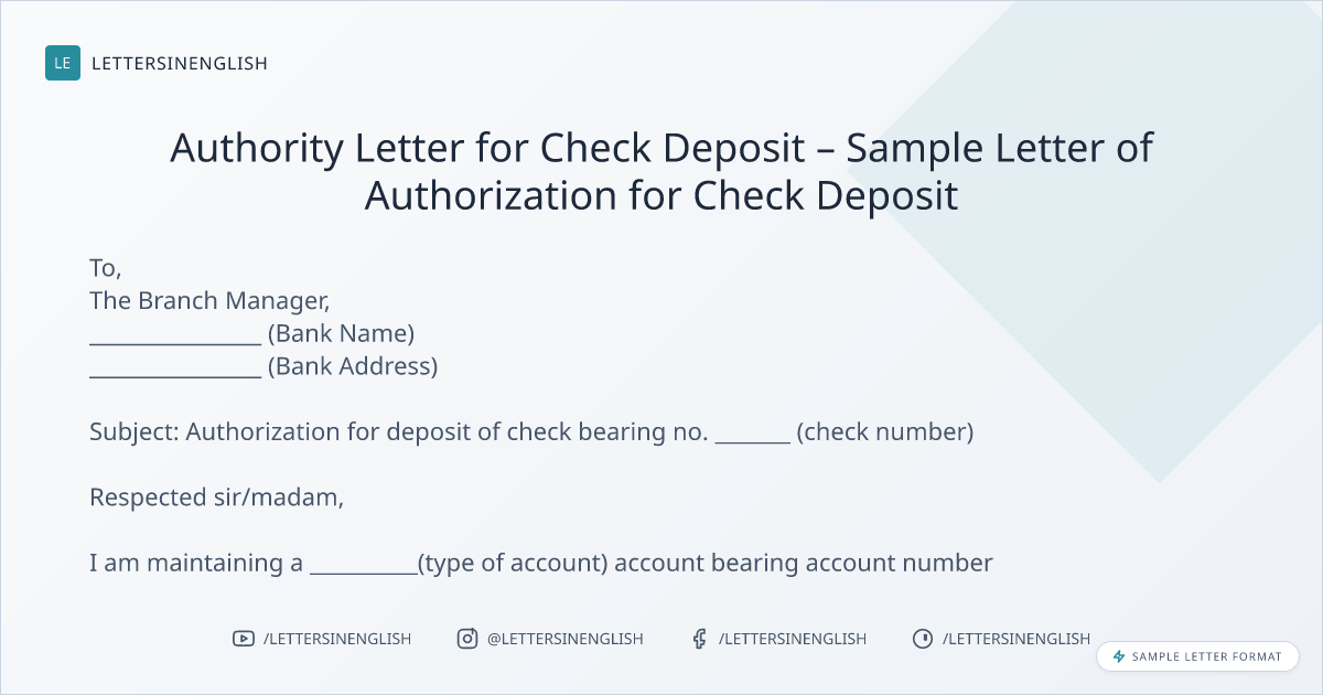 Authority Letter for Check Deposit – Sample Letter of Authorization for Check Deposit