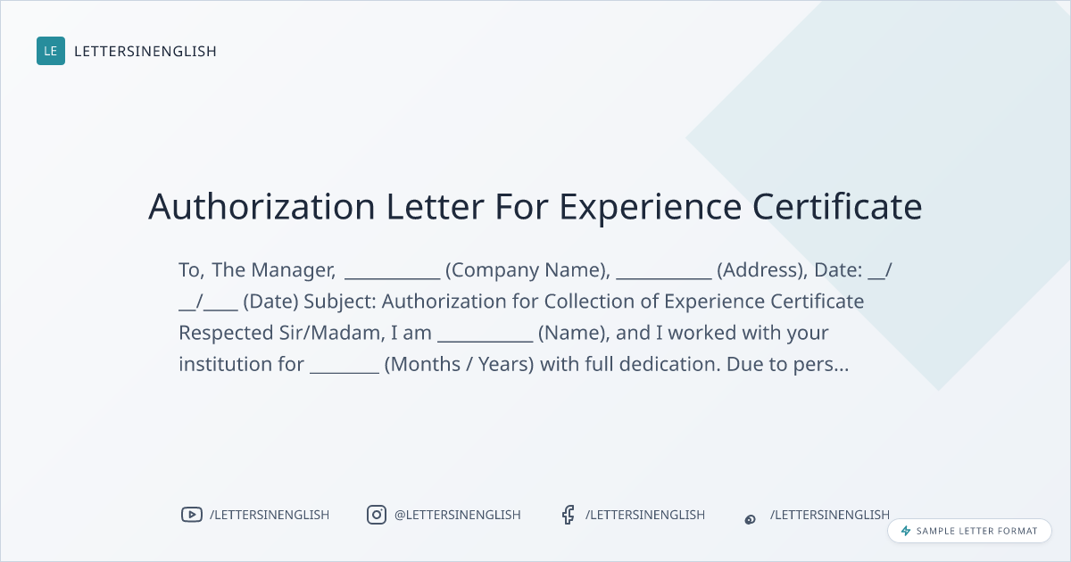 Due to my unavailability, I hereby authorise Mr/Mrs/Ms ____________ (Name), __________ (Contact number) to collect experience letter issues in my name from the reception of your office.