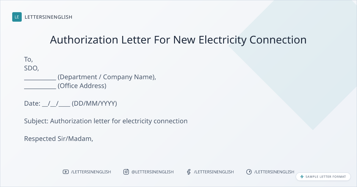 I ___________ (Name), was supposed to submit documents on my request of getting new electric connection at _____________ (Address), but due to some inevitable reasons/circumstances, I was unable to reach your office today. So, I hereby, authorise __________ (Name), ___________ (Relation) to do the process. He/She will be completely responsible for the submission of all required documents.