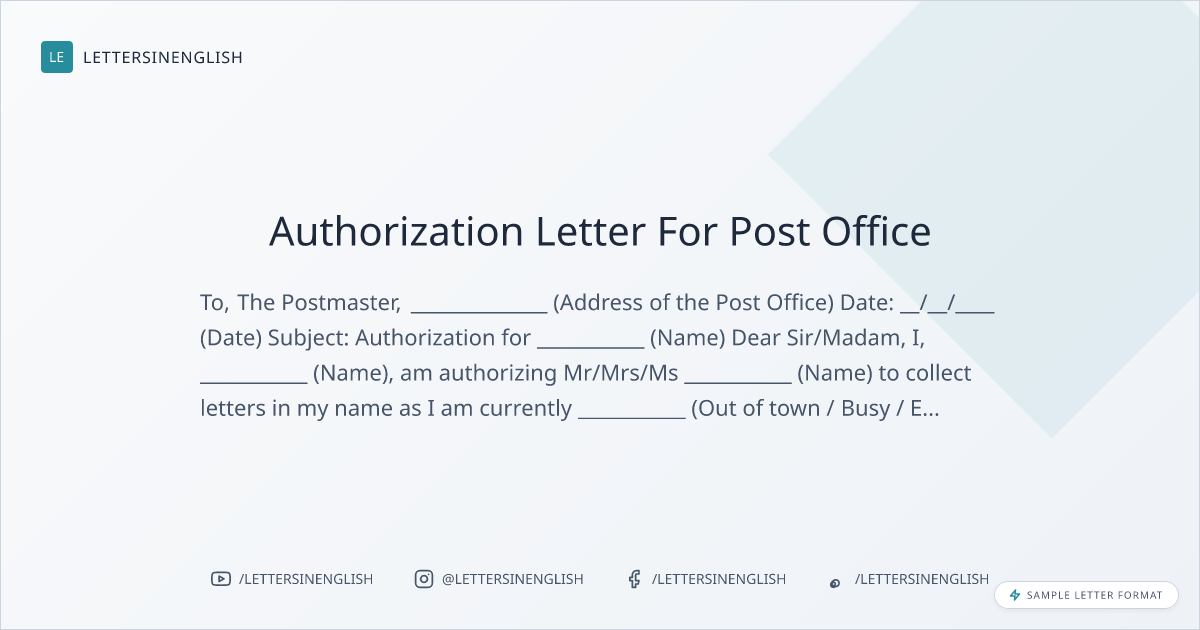 I ___________ (Name), am authorising Mr/Mrs/Ms ___________ (Name) to collect letters in my name as being ___________ (Out of town / Busy / Engaged With Some Work) I am not available at the moment. I hereby request you to kindly handover the letters for address ______________ (Your address) to the authorized person.