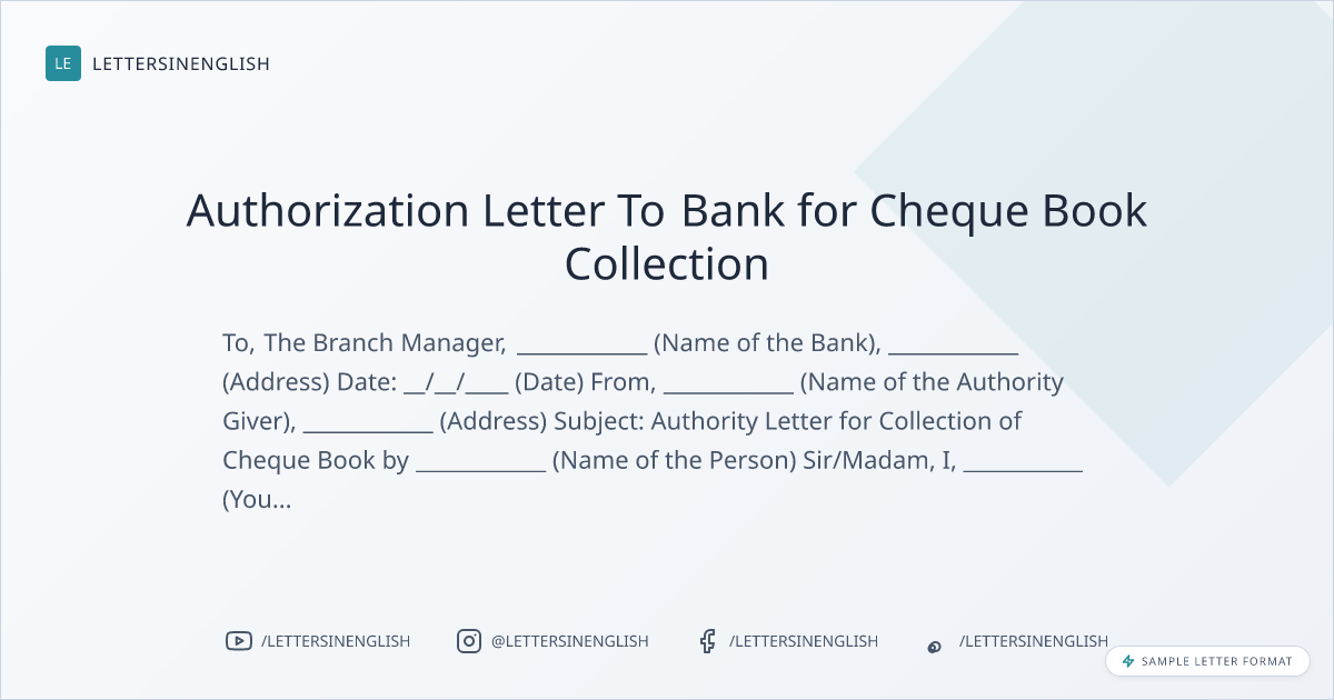 Subject: Authority letter for collection of cheque book by ____________ (name of the person)